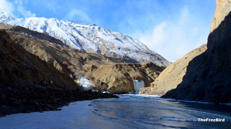 After negotiating the curve finally the most beautiful waterfall started to be visible. It appeared as if the snow clad mountain was oozing through its walls as the frozen waterfall and creating the mighty chadar.