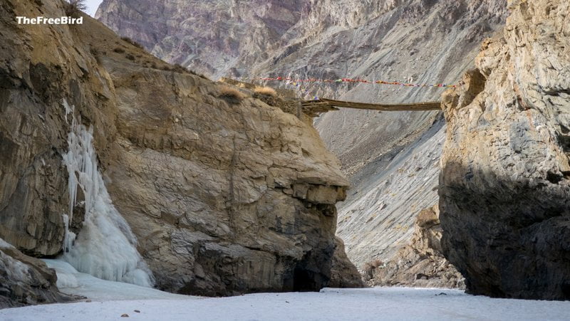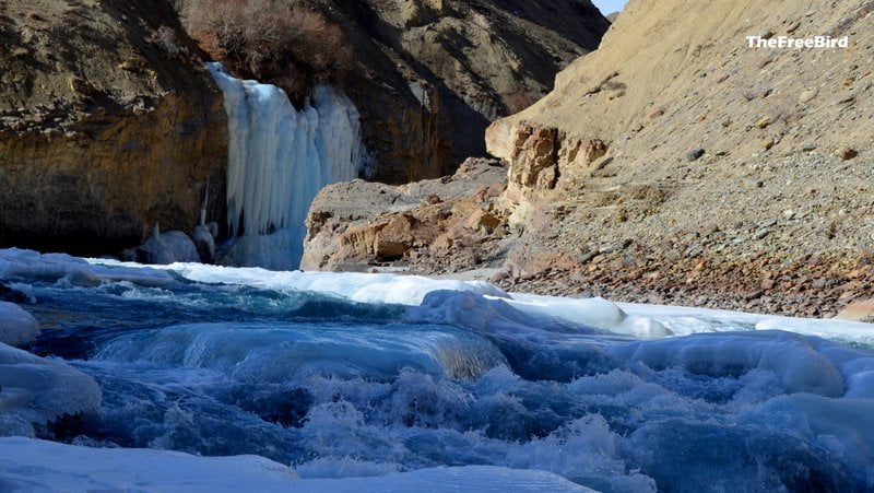 As we neared the waterfall, the nature provided a dramatic drum roll. Zanskar was playing a welcome song to the tune of its rapids trying to take over the chadar. With the waterfall within a stone’s throw I remembered these golden words from ‘ A Farewell A Welcome’
